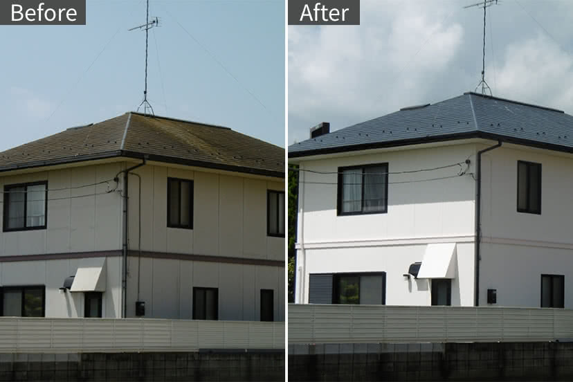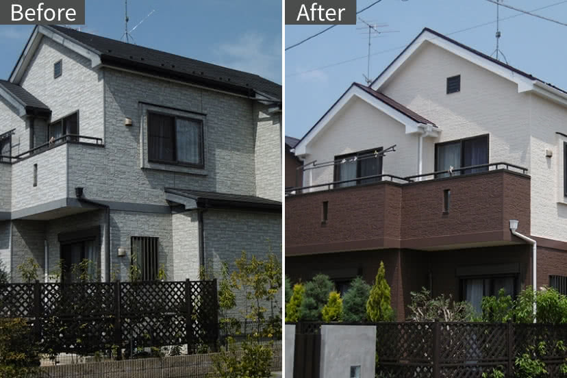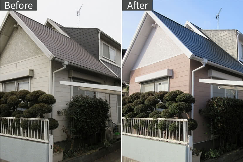 ジョリパッド仕上げで、その特質上、コケや雨染みが目立ちやすかったお宅。汚れが付きにくく、かつ既存の雰囲気を壊さないため5分艶仕上げに。さらに、太陽光を高反射・高排熱する効果のあるオリジナル遮熱塗料のJ-COOL EXを使用し、熱の影響を低減させました。